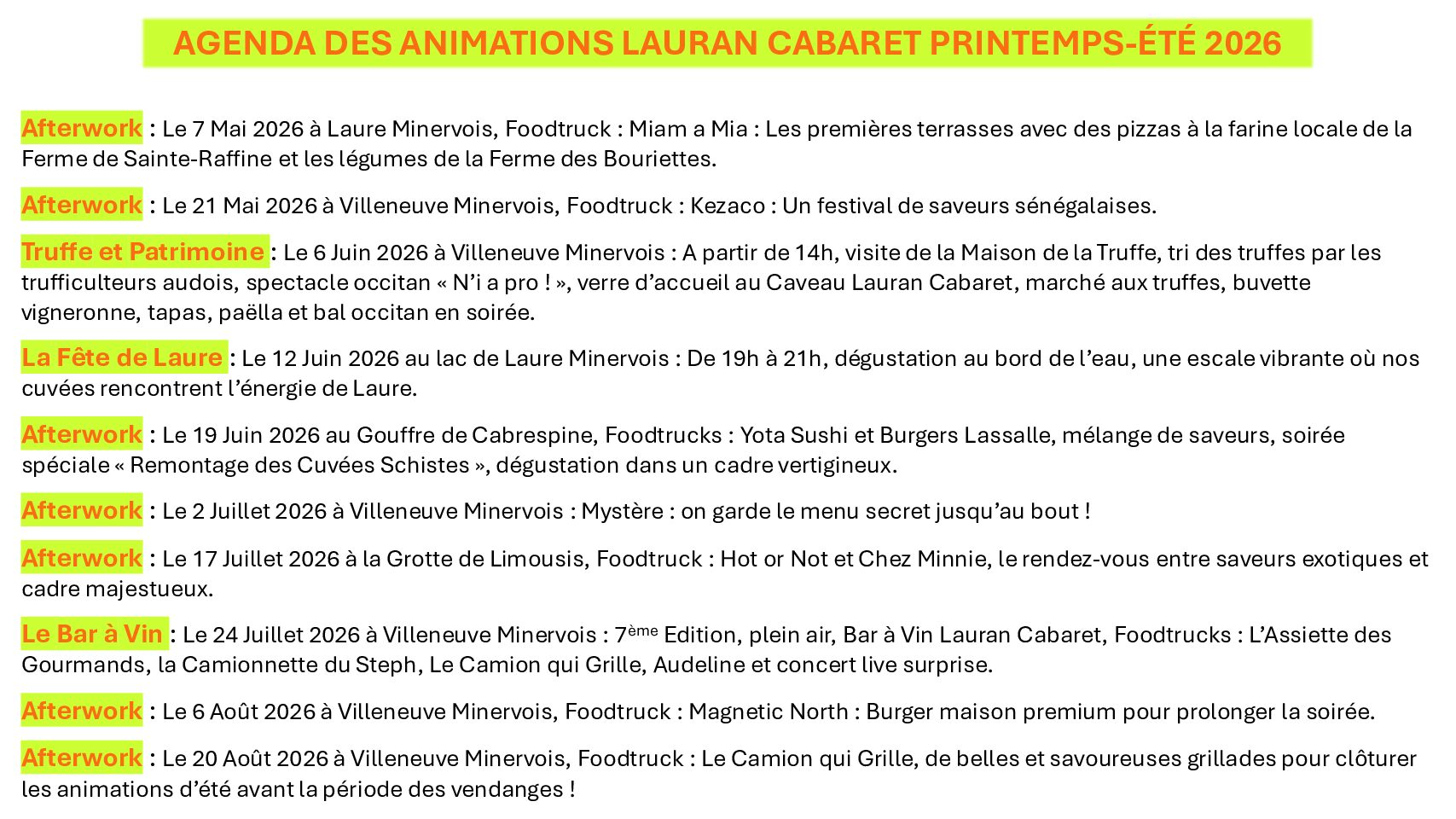 Nous avons choisi l’audace et la sincérité afin de vous offrir des moments de convivialité qui ont du sens, avec des partenaires passionnés. C’est notre façon de faire vibrer notre terroir avec vous. Sur les places de nos villages, comme dans l’ombre majestueuse du Gouffre de Cabrespine ou de la Grotte de Limousis, nos vignerons vous attendent nombreux.